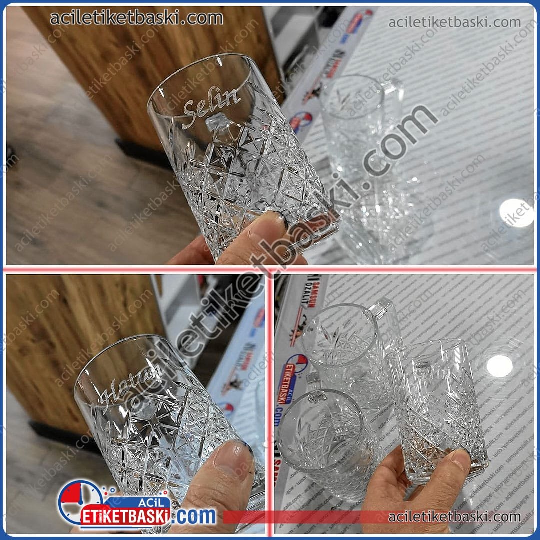 Cam ve kristal bardaklar üzerine lazer kazıma ile yapılan kalıcı baskı. Yıkanabilir, silinmez ve kişiye özel üretim. Samsun lazer baskı merkezi.