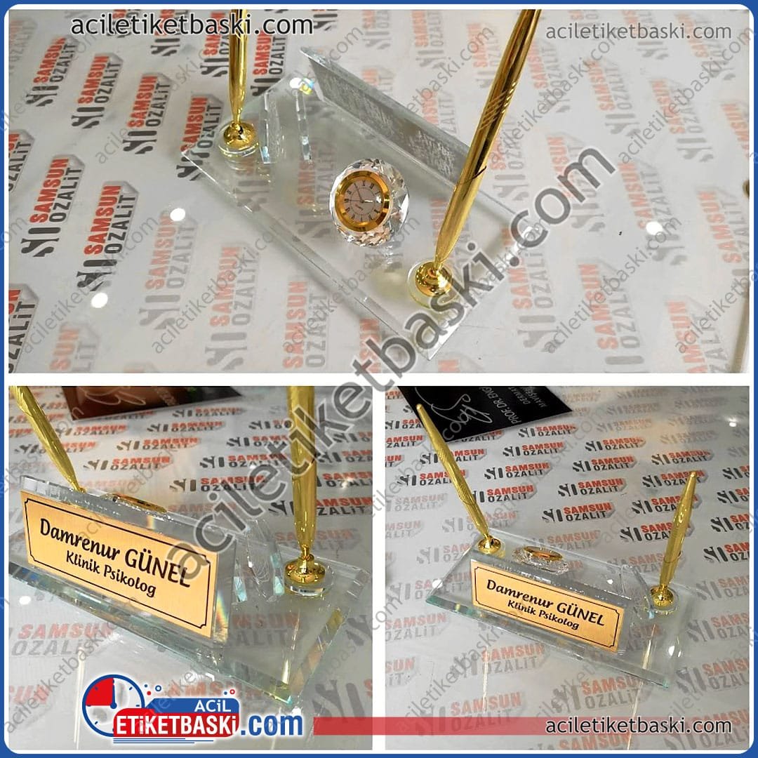 Kristal masa isimliği, saatli, 2 adet imza kalemi, kartvizitlik bölümü, isim ve ünvan yazılı tabelası, masa üzeri kullanıma uygun, hediye ürün, makam isimliği, üretim imalat, tasarım